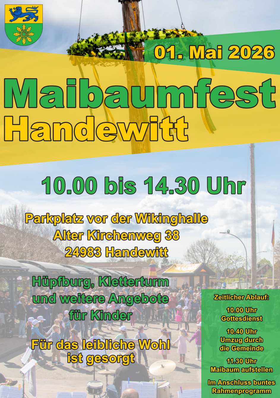 Von 11-14:30 Uhr findet ein Maibaumfest mit bunten Rahmenprogramm auf dem Parkplatz der Wiking-Halle statt.