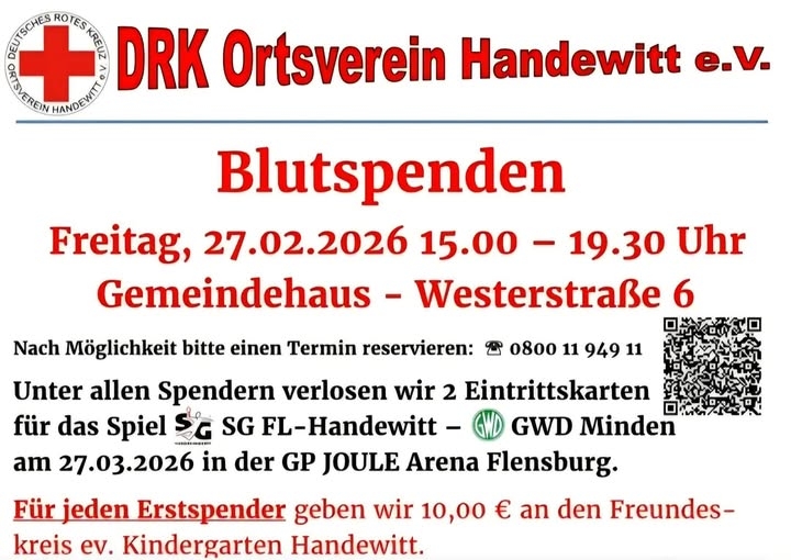Der DRK-Ortsverband Handewitt lädt wieder zum Blutspenden ein! Am Freitag, den 27. Februar, von 15 bis 19:30 Uhr ist das Gemeindehaus zum Blutspendezentrum umgebaut. Nach der Spende gibt es für alle Spender*innen und Helfenden wie immer eine selbstgekochte, warme Stärkung. Wir freuen uns auf euch!